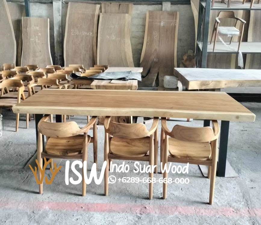 Kombinasi antara slab trembesi dan kaki kayu menciptakan kesatuan estetika alami yang kuat. Pilihan ini sangat cocok untuk ruang bergaya rustic, bohemian, klasik, atau tropical.ika kaki meja menggunakan jenis kayu yang senada (misalnya trembesi juga), maka keseluruhan meja tampak menyatu, memberikan kesan elegan dan harmonis.Penggunaan material kayu sepenuhnya menjadikan meja ini lebih ramah lingkungan dan berkelanjutan, terutama jika menggunakan kayu dari sumber legal dan dikelola secara lestari.