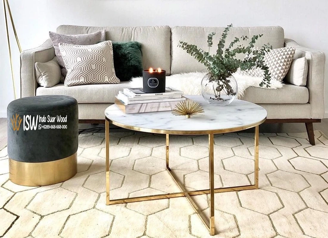 Buat ruang tamu anda lebih terkesan dengan coffee table,meja rendah yang biasanya ditempatkan di depan sofa untuk meletakkan berbagai barang seperti minuman, majalah, buku, dan dekorasi. Bagian atas meja terbuat dari Marmer, dipadukan dengan rangka dari besi untuk menopang bebannya.