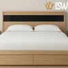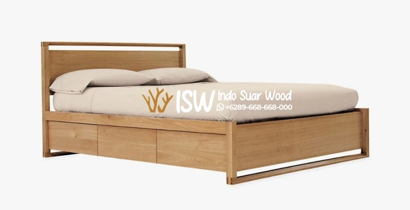 Rangka terbuat dari kayu solid yang memiliki finishing halus sehingga serat kayunya terlihat jelas. Dilengkapi dengan laci penyimpanan yang terintegrasi di bawah rangka, sangat berguna untuk menyimpan sprei, selimut, atau barang pribadi agar kamar tetap teratur.