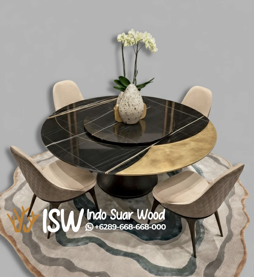 Kombinasi antara marmer dan kayu jati menjadikan meja makan kali ini banyak diincar oleh para pecinta baik dari dalam maupun luar negeri. marmer merupakan bahan alami yang berasal dari batuan alam Setiap potongan marmer memiliki urat dan corak unik, memberikan tampilan yang eksklusif dan menambah kesan mewah pada ruang makan sehingga meja makan marmer sangat cocok untuk penggunaan jangka panjang.