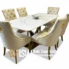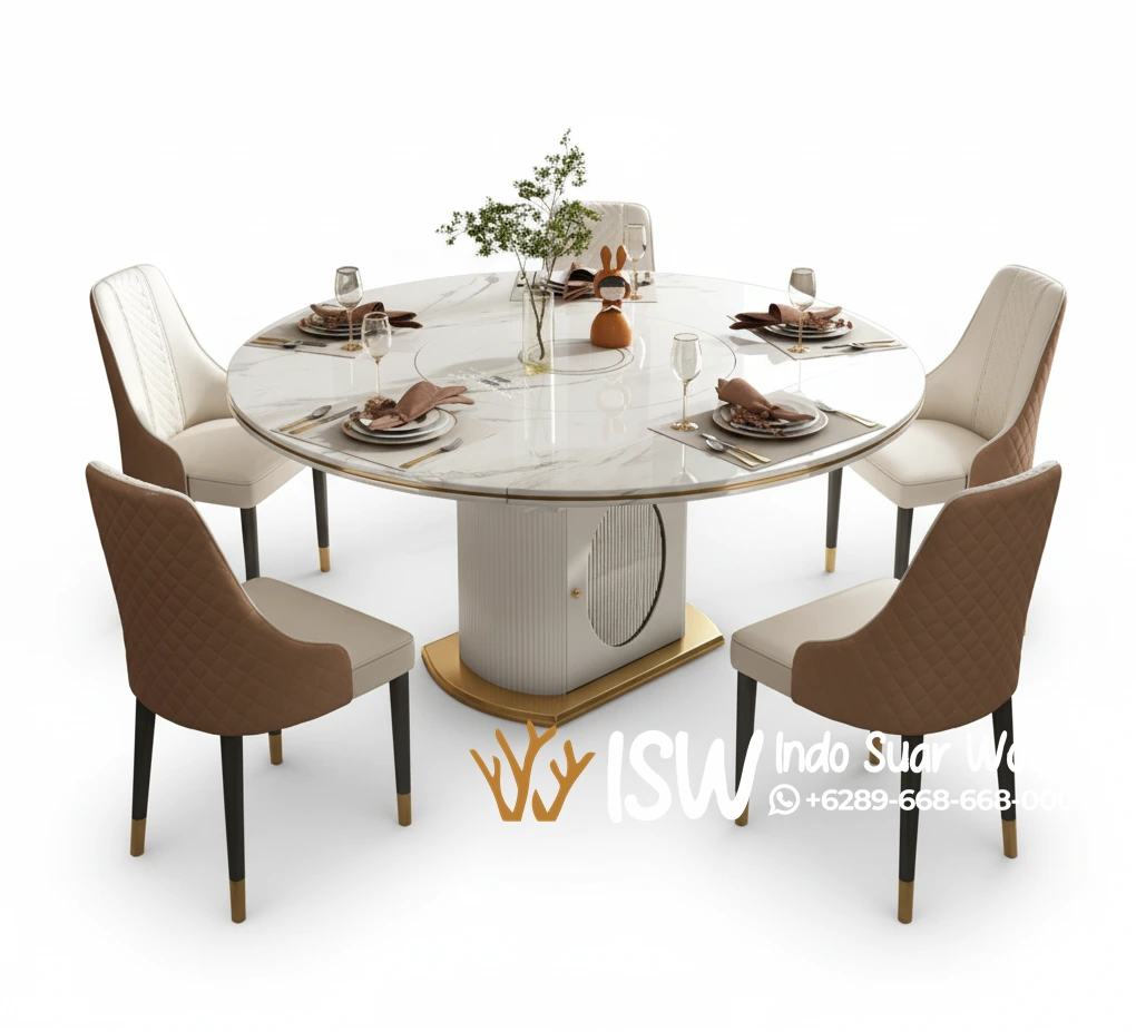 Meja makan marmer jenis ini cocok untuk berbagai gaya dekorasi, seperti minimalis modern, luxury glam, skandinavia, hingga klasik modern. Posisinya di tengah ruangan akan menjadi pusat perhatian yang memancarkan kemewahan dan keindahan alami.