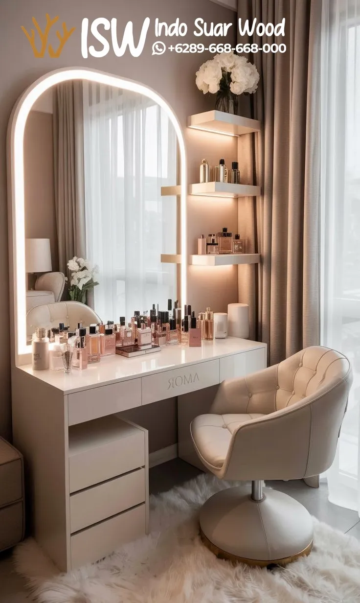 Salah satu Fungsi utama meja rias adalah sebagai tempat khusus untuk merias diri, menyimpan kosmetik dan peralatan kecantikan lainnya secara rapih dan tertata, serta berfungsi sebagai elemen dekorasi yang mempercantik ruangan tidur dan dilengkapi dengan Cermin pada meja rias dapat memantulkan cahaya matahari, sehingga ruangan terasa lebih terang dan yang paling penting juga bisa digunakan untuk bercermin.