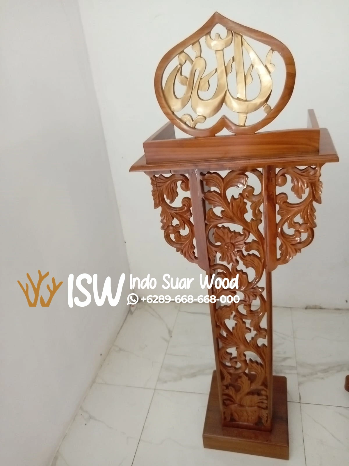 Mimbar Podium Ukiran Salatiga adalah mimbar yang terbuat dari kayu jati, dengan ukiran yang khas dan indah. Kayu jati dikenal kuat dan tahan lama, tahan terhadap serangan hama dan perubahan cuaca, serta memiliki serat kayu yang unik dan indah. Mimbar ini digunakan sebagai tempat berpidato atau ceramah dalam berbagai acara, baik formal maupun non-formal. Memiliki desain yang lebih Islami, dengan ukiran kaligrafi atau motif-motif khas masjid. Selain itu, juga memiliki desain yang lebih sederhana namun tetap elegan, cocok untuk berbagai acara. Salatiga adalah sebuah kota kecil yang terletak di Provinsi Jawa Tengah, dikenal sebagai kota toleran, kota pendidikan, dan juga kota transit pariwisata karena lokasinya yang strategis di jalur regional Jawa Tengah. Mimbar Podium Ukiran Salatiga merupakan pilihan yang tepat bagi Anda yang mencari mimbar berkualitas dengan desain yang khas dan elegan.