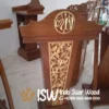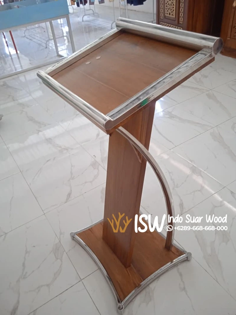 Secara keseluruhan, podium ini merepresentasikan perpaduan antara keindahan desain tradisional dari kayu dan sentuhan modern dari stainless. Cocok digunakan di berbagai tempat seperti ruang seminar, ruang ibadah, ruang rapat, atau panggung acara formal. Produk ini juga membawa kesan eksklusif dan berkelas, memperlihatkan perhatian terhadap detail dan kualitas pengerjaan.