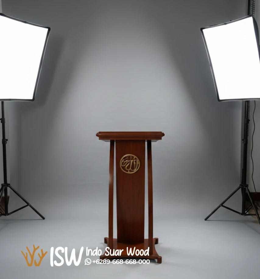Selain tampil menawan, podium ini juga memperhatikan kenyamanan pengguna. Bagian atas podium luas untuk meletakkan kitab atau teks khutbah, pijakan kokoh, pegangan kuat, serta ketinggian yang proporsional sehingga memudahkan imam atau penceramah saat menyampaikan ceramah dan khutbah di depan jamaah.
