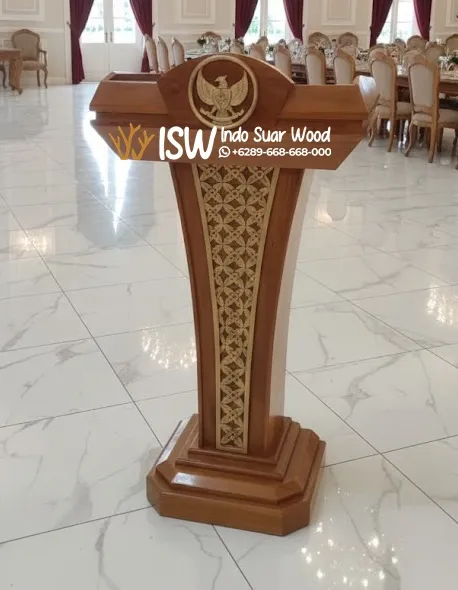 Podium umunya dibuat dari kayu jati dan untuk podium di atas kami menggunakan kayu jati sebagai bahan utamanya, karena kekuatan, keawetan, dan keindahan alaminya, tampilan seratnya yang elegan membuat setiap produk dari kayu jati terlihat natural dan memiliki karakter kuat, kayu jati terkenal sangat tahan terhadap rayap, jamur, dan perubahan cuaca, hal ini karena kandungan minyak alami yang berfungsi sebagai pelindung.