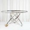 Dari sisi desain, bentuk bulat yang halus memberikan kesan modern minimalis namun tetap luxury. Model ini sangat cocok dipadukan dengan konsep interior modern, glam, klasik, kontemporer, hingga industrial mewah. Kaki meja stainless emas juga membantu menciptakan kesan ruangan yang lebih berkelas, rapi, dan berestetika tinggi, baik digunakan untuk kebutuhan rumah, restoran, hotel, kantor, maupun cafe premium.