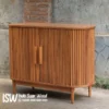 Berikut adalah produk konsul multi storage, dimana meja konsul ini memiliki desain mid century modern yang sangat menarik dengan penekanan pada fungsionalitas dan keindahan kayu alami. Dibuat dari kayu solid (mungkin dari jati atau suar) dengan lapisan warna walnut gelap yang tampil hangat dan mewah. Serat kayu terlihat jelas secara vertikal di pintu dan horizontal di laci, memberikan sentuhan alami yang kuat pada furnitur ini. Menggunakan pintu ayun dengan pegangan sederhana berwarna hitam. Biasanya furnitur ini memiliki ruang luas untuk menyimpan barang-barang besar seperti peralatan makan, buku, atau barang elektronik.