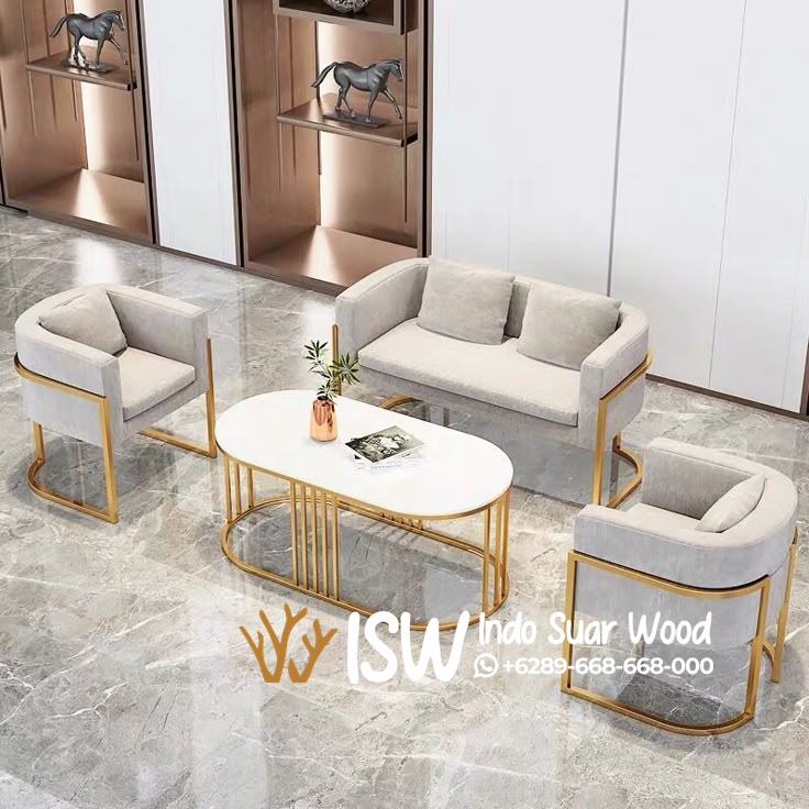 Stainless terutama yang dilapisi lapisan emas, sangat tahan terhadap karat dan korosi, sehingga kursi tetap awet dan tahan lama. Stainless juga tahan terhadap panas, sehingga kursi tetap aman untuk digunakan di berbagai kondisi ruangan. Stainless memiliki kombinasi yang baik antara kekuatan, fleksibilitas, dan berat yang relatif ringan, sehingga kursi tetap kokoh namun mudah dipindah-pindah. Stainless gold memberikan kesan mewah dan elegan pada kursi tamu, menambah nilai estetika ruang tamu. Beludru memberikan kesan kemewahan dan keanggunan pada kursi tamu, menjadikannya pilihan yang tepat untuk menciptakan suasana yang berkelas. Tekstur beludru yang lembut dan halus memberikan sensasi nyaman saat duduk, cocok untuk menciptakan suasana yang relaks dan tenang di ruang tamu. Meskipun terlihat lembut, beludru terbuat dari bahan yang kuat dan tahan lama, sehingga dapat digunakan untuk jangka waktu yang lama. Beludru memiliki kemampuan untuk menampilkan warna dengan lebih kaya dan berdimensi, sehingga memberikan kesan visual yang lebih menarik. Kelembutan, keindahan, dan kemewahan beludru menjadikan kursi tamu dengan bahan ini sebagai pusat perhatian di ruang tamu, memberikan kesan yang indah dan berkelas.