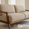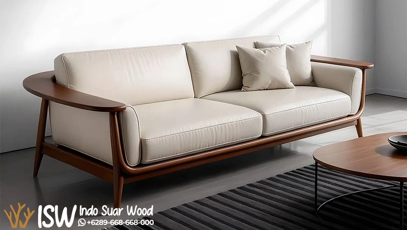 Material rangka kayu jati solid pilihan dengan finishing natural doff yang menonjolkan serat kayu asli. Mengusung desain mid-century modern dengan detail lengkungan pada sandaran tangan (armrest) yang nyaman dan elegan. Menggunakan busa high-resilience yang dilapisi dengan kulit sintetis (premium faux leather) berwarna krem/broken white, memberikan kesan bersih dan luas.