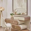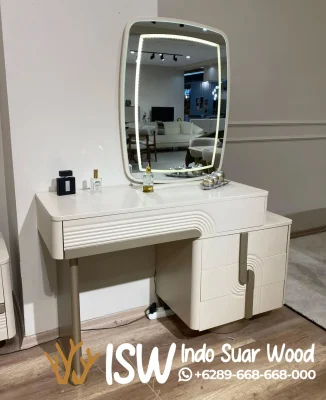 Kombinasi sempurna antara gaya minimalis modern dengan elemen mewah, meja ini dirancang untuk memberikan kenyamanan maksimal saat Anda bersiap menghadapi hari.Menggunakan material berkualitas tinggi, meja ini memiliki kaki kayu solid yang kuat dan tahan lama, serta permukaan halus yang mudah dibersihkan. Dilengkapi dengan cermin besar yang memiliki pencahayaan LED di belakangnya (Glow Effect), sehingga memancarkan cahaya yang merata dan lembut di wajah, sangat ideal untuk kegiatan make-up yang presisi. Meja ini juga dilengkapi dengan kursi (stool) minimalis yang empuk, senada dengan desain meja.