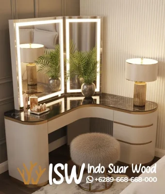 Kombinasi sempurna antara gaya minimalis modern dengan elemen mewah, Make Up Table Estetik ini dirancang untuk memberikan kenyamanan maksimal saat Anda bersiap menghadapi hari.Menggunakan material berkualitas tinggi, meja ini memiliki kaki kayu solid yang kuat dan tahan lama, serta permukaan halus yang mudah dibersihkan. Dilengkapi dengan cermin besar yang memiliki pencahayaan LED di belakangnya (Glow Effect), sehingga memancarkan cahaya yang merata dan lembut di wajah, sangat ideal untuk kegiatan make-up yang presisi. Meja ini juga dilengkapi dengan kursi (stool) minimalis yang empuk, senada dengan desain meja.