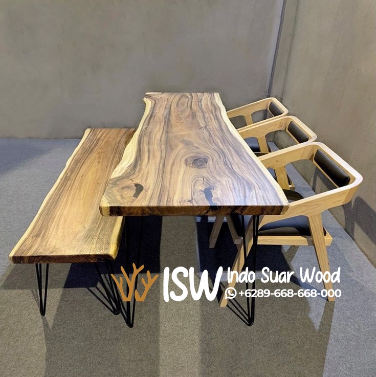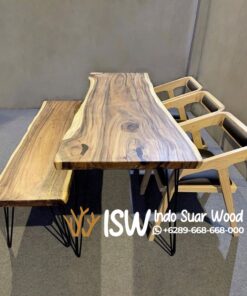 Meja Kayu Utuh Kaki Besi dengan finishing natural akan semakin unik dan cantik karena kayu trembesi ini memiliki corak yang unik menambah kesan aesthetic pada ruangan. Meja makan ini mempunyai tekstur yang lembut alami dari kayu trembesi itu sendiri.