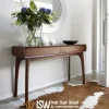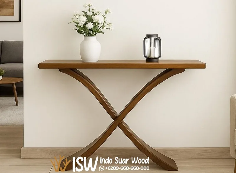 Meja Konsul Estetik Simpul Silang Jati ini mengusung tema modern contemporary dengan elemen organik. Ciri khas utamanya adalah desain kaki “simpul silang” yang melengkung dengan dinamis, menciptakan ilusi pergerakan sekaligus memberikan stabilitas yang kokoh.