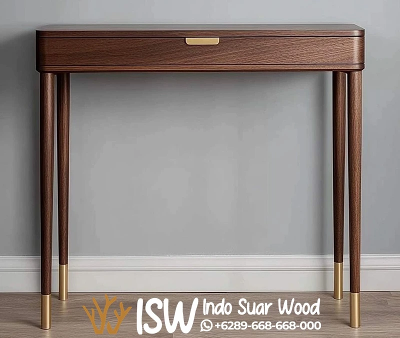 Meja Konsul Jati Walnut Aksen Gold ini memadukan kemewahan kontemporer dan kehangatan bahan alami secara harmonis. Mengadopsi gaya Mid-Century Modern yang diperkaya sentuhan luxury kontemporer, meja ini dirancang menjadi focal point di ruang tamu, koridor, atau foyer rumah Anda.