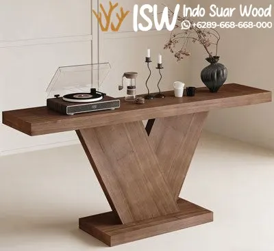 Meja Konsul Kayu Jati Desain Kaki V menciptakan siluet yang menarik namun tetap kuat. Dibuat dengan bahan kayu jati pilihan, meja ini menampilkan pesona serat kayu alami yang hangat, sangat cocok untuk menghiasi area pintu masuk, ruang keluarga, atau koridor rumah Anda.