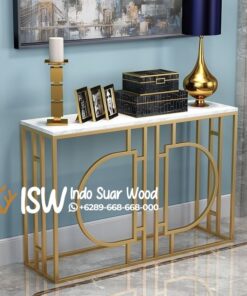 Ngawi adalah sebuah kabupaten di Jawa Timur dikenal sebagai sentra kerajinan kayu jati, terutama gembol kayu jati dan produk dari limbah kayu jati. Meja Konsul Marmer Kota Ngawi memiliki desain mewah dan elegan, dipadukan dengan rangka stainless gold berkualitas tinggi. Permukaan meja terbuat dari bahan marmer carara yang terkenal kuat tahan lama, tahan panas, serta memiliki warna putih dan serat pola berwarna abu-abu, menambah sentuhan mewah. Stainless dikenal memiliki kekuatan yang tinggi, tahan karat dan korosi, sehingga cocok untuk meja konsul yang sering digunakan tidak mudah rusak. Warna gold pada stainless memberikan kesan mewah dan elegan, cocok untuk berbagai gaya interior. Meja ini berfungsi sebagai elemen dekoratif dan tempat memajang barang-barang di ruang tamu atau area lain.