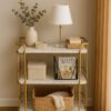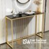 Marmer putih memiliki beberapa kelebihan untuk digunakan sebagai permukaan meja konsul, antara lain tampilan yang mewah dan elegan, mudah dipadukan dengan berbagai gaya interior, dan tahan terhadap noda serta air. Selain itu, marmer juga mudah dibersihkan dan tahan lama jika dirawat dengan baik. Kaki meja konsul dari stainless steel warna gold (atau rose gold) memiliki beberapa kelebihan, terutama dari segi estetika, ketahanan, dan perawatan. Stainless sendiri dikenal karena kekuatannya, ketahanan terhadap korosi dan karat, serta mudah dibersihkan. Warna gold atau rose gold memberikan kesan mewah dan elegan pada furnitur.