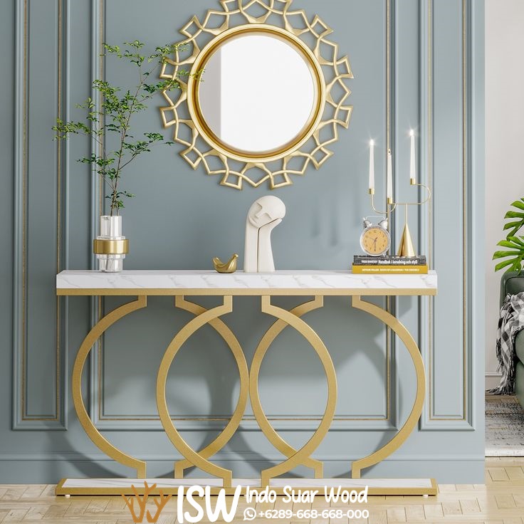 Meja Konsul Marmer Modern Kota Madiun ini terbuat dari bahan marmer carara dan stainless gold pada tepian meja dan kaki meja yang berbentuk tiga lingkaran, sehingga membuat meja konsul terihat elegan dan mewah. Marmer carara dikenal tahan panas dan goresan, daya tahan yang tinggi, serta memiliki warna dasar putih dengan urat abu-abu yang khas memberikan tampilan mewah dan elegan pada meja konsul. Stainless gold memiliki kekuatan yang tinggi, tahan karat dan korosi, serta tampilan mewah dan modern pada kaki meja konsul. Meja konsul berfungsi sebagai tempat penyimpanan tambahan dan menampilkan dekorasi seperti vas bunga, hiasan meja, atau buku. Kota Madiun terletak di Jawa Timur yang dikenal sebagai Kota Gadis dan Kota Pendekar. Madiun juga dikenal sebagai Kota Brem karena makanan khasnya, brem. Pilih Meja Konsul Marmer Modern Kota Madiun untuk memperindah ruangan dan menjadi pelengkap interior ruangan.