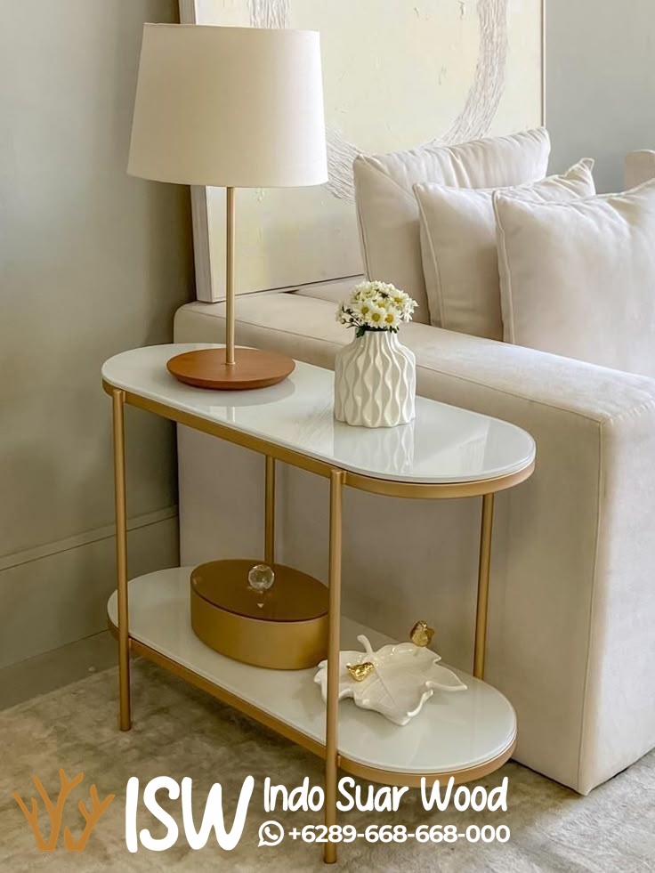Meja Konsul Marmer Oval Kota Kuningan ini terbuat dari marmer putih berbentuk oval pada permukaan meja dan bahan stainless gold pada bagian kaki meja. Marmer putih memiliki beberapa kelebihan untuk digunakan sebagai permukaan meja konsul, antara lain tampilan yang mewah dan elegan, mudah dipadukan dengan berbagai gaya interior, dan tahan terhadap noda serta air. Selain itu, marmer juga mudah dibersihkan dan tahan lama jika dirawat dengan baik. Kaki meja konsul dari stainless steel warna gold (atau rose gold) memiliki beberapa kelebihan, terutama dari segi estetika, ketahanan, dan perawatan. Stainless sendiri dikenal karena kekuatannya, ketahanan terhadap korosi dan karat, serta mudah dibersihkan. Warna gold atau rose gold memberikan kesan mewah dan elegan pada furnitur. Pilih Meja Konsul Marmer Oval Kota Kuningan agar ruangan terlihat berkelas dan menarik perhatian.