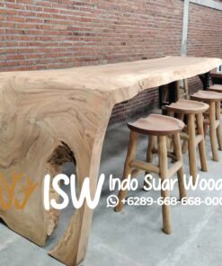 pada umumnya meja kayu utuh dibuat dengan kayu besar seperti jati, suar, mahoni, atau trembesi banyak dipilih karena daya tahannya yang kuat, awet, dan tidak mudah lapuk jika dirawat dengan baik. Meja kursi bar kayu utuh dibuat dari potongan kayu solid tanpa sambungan buatan, sehingga serat kayu, guratan, dan warna alaminya tetap terjaga. Setiap potong kayu memiliki pola unik yang berbeda satu sama lain, menjadikan setiap meja dan kursi bar benar-benar unik dan tidak ada duanya