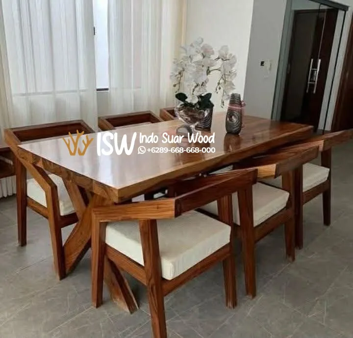 Meja Makan Jati Kaki Silang menggabungkan daya tahan kayu jati solid dengan desain modern yang geometris. Ini adalah pilihan sempurna untuk area makan dengan gaya minimalis, Skandinavia, atau industrial yang mewah.