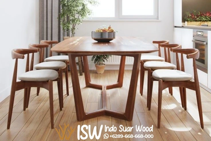 Meja makan ini menggabungkan kehangatan bahan kayu jati pilihan dengan tampilan yang sangat modern dan ergonomis. Dengan sentuhan natural finish, serat kayu jati yang istimewa tetap terlihat, memberikan nuansa hunian yang mewah namun tetap bersahaja.