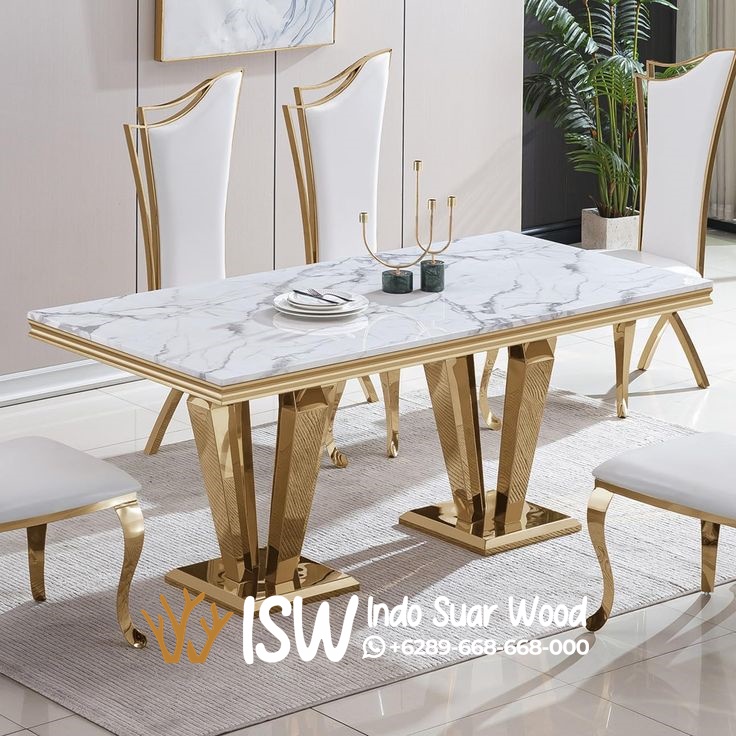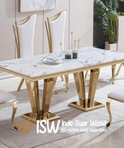 Meja Makan Kaki Stainless Unik Kota Purwokerto terbuat dari bahan marmer carara pada permukaan meja dan bahan stainless gold pada bagian kaki yng dibentuk seindah mungkin. Meja makan ini cocok diletakkan diberbagai interior ruangan sebab desainnya yang elegan dan mewah. Meja makan dari marmer Carara menawarkan kelebihan estetika, daya tahan, dan fungsionalitas. Marmer Carara memiliki tampilan yang mewah dan elegan, dengan warna dasar putih yang dihiasi urat-urat abu-abu yang halus, menciptakan kesan yang tak lekang oleh waktu. Selain itu, marmer tahan panas, sehingga Anda bisa meletakkan piring panas langsung di atasnya tanpa khawatir.