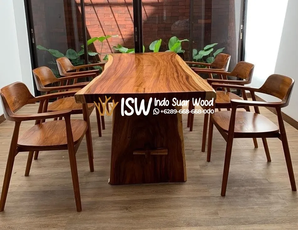 Investasi jangka panjang: Karena kualitas dan kelangkaannya, meja makan kayu jati utuh menjadi produk premium yang sering dicari untuk menambah nilai estetika dan prestise pada hunian.