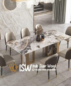 Meja Makan Marmer Corak Elegan Tulungagung adalah meja makan yang terbuat dari batu marmer berkualitas tinggi yang berasal dari daerah Tulungagung, Jawa Timur. Tulungagung adalah kabupaten yang dikenal sebagai Kota Marmer karena industri marmer yang berkembang pesat dan menjadi salah satu unggulan daerah. Meja ini terkenal karena keindahan alami corak dan motif pada marmernya, serta desainnya yang elegan dan modern. Kelebihan meja makan marmer Tulungagung meliputi keawetan, kemudahan perawatan, dan kemampuan untuk menambah sentuhan kemewahan pada ruang makan. Kaki meja ini di kombinasikan stainless gold yang dikenal kekuatannya, daya tahan tinggi, serta menambah sentuhan mewah pada ruangan. Meja Makan Marmer Corak Elegan Tulungagung adalah pilihan yang bagus untuk mempercantik ruang makan Anda.