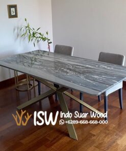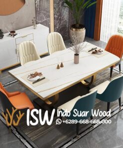 Meja Makan Marmer Jepara ini terbuat dari bahan marmer pada permukaan meja dan bahan stainless gold pada bagian kakai meja. Meja makan berfungsi untuk menyajikan dan menikmati makanan dan minuman, serta juga dapat menciptakan suasana hangat dan menambah nilai estetika. Marmer memiliki keindahan, daya tahan, dan kemewahan yang tak tertandingi. Meja makan marmer mempunyai tampilan yang elegan, tahan lama, mudah dibersihkan, dan tahan panas. Stainless gold terkenal tahan karat, mudah dibersihkan, tampilan modern dan elegan, serta tahan lama. Stainless gold juga memberikan kesan mewah dan stylish pada ruangan. Pilih Meja Makan Marmer Jepara untuk menambah nilai estetika ruangan dan terlihat modern dan indah. Jepara merupakan salah satu daerah pusat penghasil kerajinan ukiran kayu dan mebel terbesar di Indonesia.