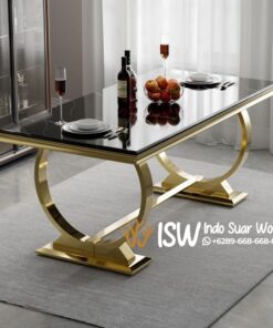 Kota Blitar terletak di Provinsi Jawa timur dikenal sebagai “Kota Patria” karena sejarahnya yang kaya dan kaitannya dengan perjuangan kemerdekaan Indonesia. Meja Makan Marmer Kaki Stainless Blitar memiliki desain mewah dan elegan, terbuat dari bahan marmer hitam pada permukaan dan bahan stainless gold pada kaki meja berbentuk dua cincin yang indah. Marmer hitam dikenal sangat kuat dan tahan lama, tahan panas, sehingga ideal untuk meja makan yang sering digunakan. Warna hitamnya yang pekat dengan urat putih alami memberikan kesan dramatis dan modern pada ruangan, sementara sifat marmer yang kuat membuatnya tahan lama dan cocok untuk penggunaan sehari-hari. Stainless gold untuk kaki meja dikenal kuat, tahan lama, tahan karat dan korosi, serta warna goldnya memberikan sentuhan mewah dan modern. Meja Makan Marmer Kaki Stainless Blitar pilihan yang tepat untuk menambah estetika dan mempercantik ruang makan Anda.