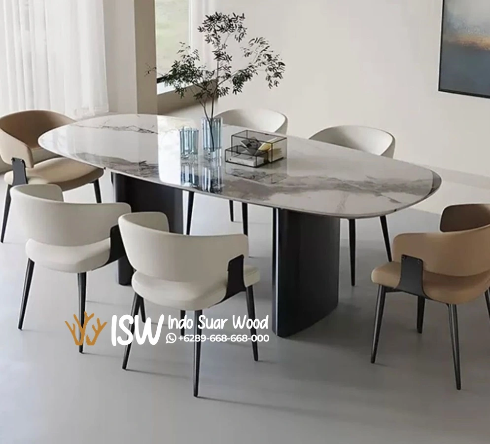 Tidak hanya menggunakan desain bulat atau persegi panjang, meja makan dengan bentuk oval juga memilki kelebihan tersendiri yang pastinya membuat anda ingin memilikinya. lantas apa saja kelebihan meja makan dengan bentuk oval? Bentuk oval memberikan kesan harmonis dan lebih ramah ruang. Selain memudahkan sirkulasi, meja oval juga menciptakan suasana makan yang lebih hangat dan akrab. Hingga saat ini, Meja Makan Marmer Oval Putih masih digunakan dan menjadi pilihan populer untuk ruangan makan. Meskipun meja makan oval telah mengalami perubahan dalam desain dan bahan, bentuk oval yang elegan dan serbaguna masih tetap dipertahankan hingga saat ini.