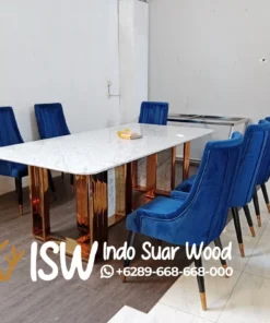 Sebagai contoh model diatas Meja Makan Marmer Terbaru 8 Kursi produk real dari CV Indo suar wood perusahaan kami yang sudah malang melintang didunia meja makan marmer kaki stainless gold dengan top marmer import dari eropa tepatnya negara Itali, Karena mungkin italy adalah negara penghasil marmer paling besar didunia dan setiap gunung dinegara tersebut mempunyai batu yang mengandung marmer. Kombinasi material tersebut bukan hanya menambah kekokohan, tetapi juga mempertegas karakter desain mulai dari klasik, minimalis modern, hingga glamor mewah dengan aksen emas.