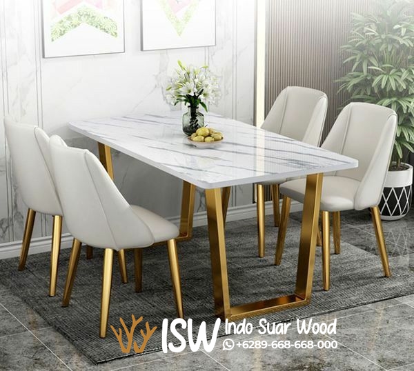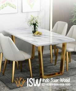 Meja Makan Stainless Elegan Kota Bondowoso memiliki desain mewah, elegan, dan modern. Meja makan ini terbuat dari bahan marmer carara pada bagian permukaan meja dan bahan stainless gold pada bagian kaki meja yang terlihat modern. Stainless khususnya yang berlapis gold, memberikan kesan mewah dan elegan, serta tahan terhadap korosi dan mudah dibersihkan. Marmer Carara dikenal karena tampilannya yang mewah dan elegan, dengan pola urat dan warna alami yang unik. Marmer Carara adalah batu alam yang kuat dan tahan lama, sehingga meja makan berbahan marmer ini dapat bertahan selama bertahun-tahun. Marmer Carara memiliki kemampuan alami untuk menahan panas, sehingga Anda dapat meletakkan piring panas langsung di atas meja tanpa khawatir merusaknya. Permukaan marmer Carara yang halus membuatnya mudah dibersihkan dari kotoran dan noda. Marmer Carara juga dapat memberikan sentuhan klasik dan elegan pada ruang makan Anda. Dengan perawatan yang tepat, meja makan marmer Carara akan tetap indah dan awet selama bertahun-tahun. Meja makan yang didesain dengan baik dapat menjadi pusat perhatian di ruang makan dan mempercantik interior rumah. Meja makan berfungsi sebagai tempat untuk menyajikan dan menikmati makanan, meja makan juga menjadi tempat berkumpul keluarga, tempat belajar, dan dapat meningkatkan nilai estetika rumah. Meja makan membantu menciptakan suasana makan lebih nyaman dan akrab.