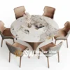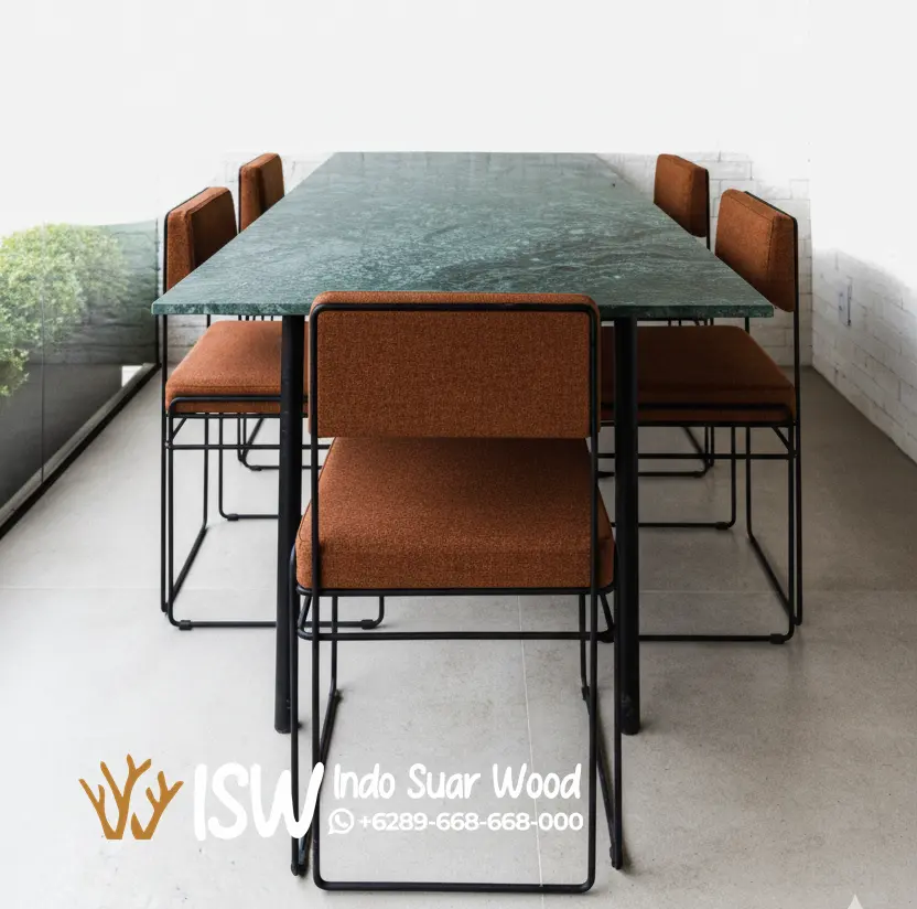 Keindahan Meja Marmer Hijau berasal dari proses metamorfosis alam selama jutaan tahun, menghasilkan pola dan gradasi warna yang tidak pernah sama. Warna hijaunya dapat bervariasi mulai dari hijau tua yang dramatis, hijau zamrud yang mewah, hingga hijau lembut yang memberi kesan natural dan menyejukkan kemudian di olah dengan baik dengan kombinasi kaki meja dari kayu, besi dan stainless tergantung dari desain yang diinginkan.