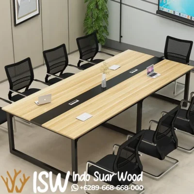 Meja ini terbuat dari rangka besi hollow berkualitas tinggi yang dilas dengan rapi, memastikan meja tetap stabil tanpa goyang. Bagian atas meja memiliki pola serat kayu alami yang memberi kesan mewah namun tetap hangat. Meja ini tahan lama dan mudah dibersihkan. Didesain dengan lubang pengelolaan kabel di tengah, sehingga meja terlihat rapi dan bebas dari kabel laptop atau proyektor saat digunakan untuk presentasi. Meja ini dapat menampung antara 6 hingga 10 orang, tergantung pada ukuran, memberikan ruang yang nyaman bagi semua peserta rapat.