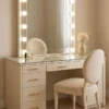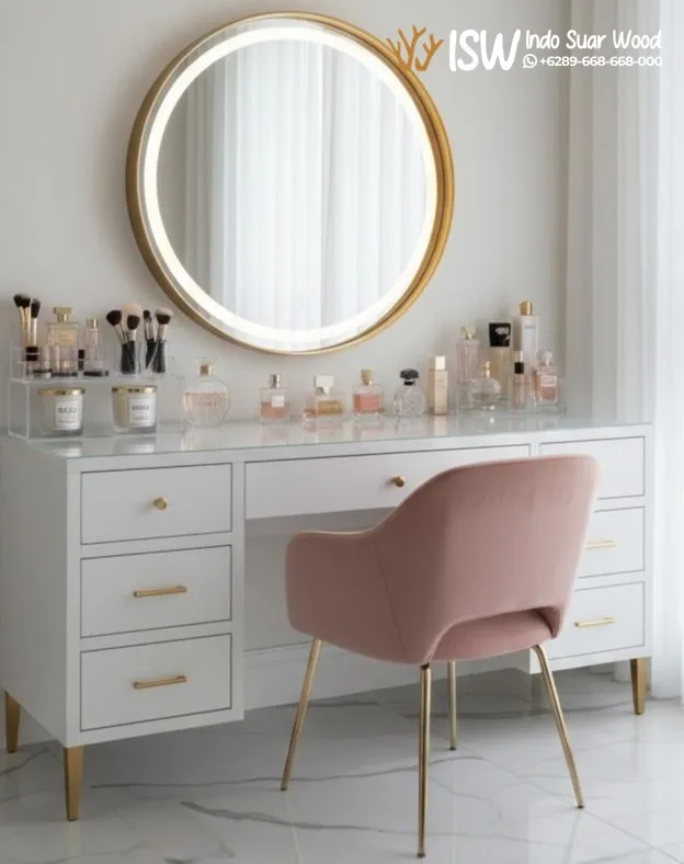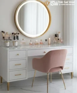 Meja Rias adalah furnitur yang dirancang untuk memberikan kenyamanan saat merawat diri dan berdandan,meja rias menjadi furniture penting yang wajib ada di dalam kamar khusunya kamar perempuan, Meja Rias Cermin Bundar Minimalis karena pada umumnya meja rias dilengkapi dengan cermin, model ini memiliki cermin berbentuk bundar sehingga menjadi ikon utama yang memberikan kesan lembut dan setara. Cermin berukuran ideal ini memudahkan aktivitas merias wajah, skincare, hingga styling rambut, selain tampil cantik, bentuk bundar juga menambah dekoratif yang membuat kamar tampak lebih hidup dan stylish, memiliki laci tambahan yang memberikan kapasitas penyimpanan lebih banyak tanpa membuat tampilan furnitur terlihat berantakan.