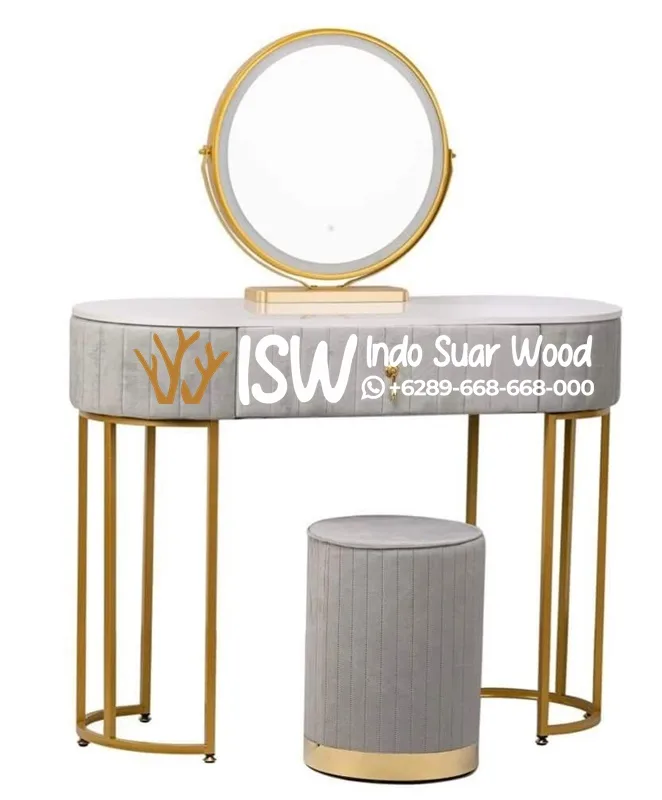 Memiliki laci penyimpanan yang luas untuk mengatur kosmetik, perhiasan, dan alat kecantikan agar tetap tertata rapi. Dilengkapi dengan cermin bulat besar yang memiliki bingkai emas serta teknologi lampu LED yang dapat diatur kecerahannya, sangat ideal untuk aplikasi makeup yang akurat.