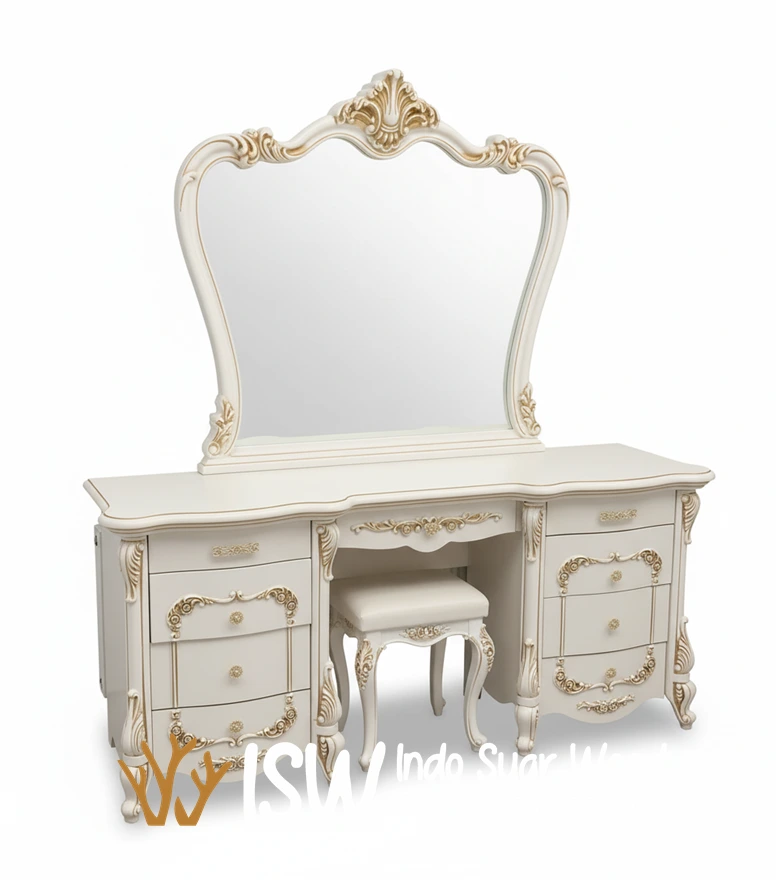 Wanita memang sangat identik dengan kecantikan, oleh sebab itu, sangat tidak heran jika kehadiran furniture yang satu ini adalah sesuatu yang wajib ada di kamar perempuan. Meja Rias Ukir Duco ini Menggunakan material kayu berkualitas seperti mahoni grade A atau jati pilihan dengan kombinasi ukiran yang dibuat langung oleh pengrajin asli meja rias ini dibuat dengan struktur kokoh dan presisi tinggi demi menghadirkan furnitur yang tak hanya indah, tetapi juga tahan lama. Setiap detail ukirannya dikerjakan secara manual oleh pengrajin berpengalaman, sehingga menghasilkan motif klasik yang halus, simetris, dan bernilai seni tinggi.