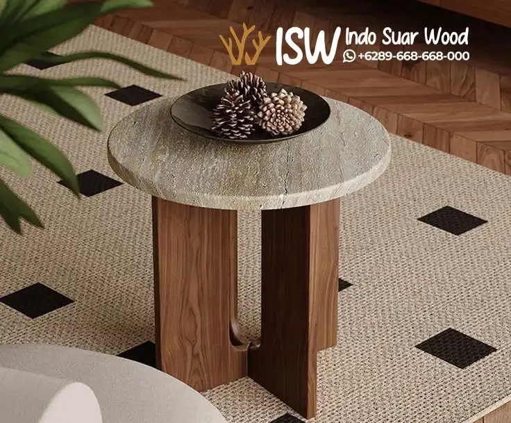 Gabungan elemen alam (batu dan kayu) menciptakan atmosfer yang lebih tenang, hangat, dan berkelas di dalam ruangan. Ukurannya yang ideal menjadikannya pilihan cerdas untuk mempercantik area kecil tanpa memberikan kesan sesak. Kaki kayu solid yang tebal memastikan daya tahan jangka panjang, sehingga tidak hanya indah dilihat tetapi juga fungsional untuk menampung dekorasi Anda.