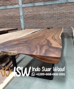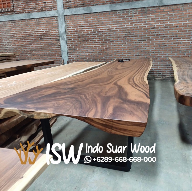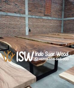 Kayu trembesi (Samanea saman) dikenal sebagai salah satu jenis kayu keras yang berasal dari pohon besar dengan tajuk melebar. Kayu ini populer di Indonesia karena seratnya yang indah, warna alaminya yang mencolok dan bergradasi dari putih gading hingga coklat tua dan bentuknya yang besar sehingga memungkinkan dibuat menjadi papan utuh tanpa sambungan. Kayu trembesi juga kerap disebut sebagai pohon ki hujan karena dapat tumbuh dengan besar dan memiliki daun serta tajung yang lebar, sehinga dapat dijadikan sebagaai tempat untuk berteduh ketika panas atau hujan. Kayu trembesi juga dapat dijadikan sebagai pilihan pengganti dari kayu jati, karena kualitasnya juga tak aklah bagusnya serta harganya yang cukup ekonomis. Sementara kayu trembesi memberikan karakter natural dan hangat. Penggunaan kaki besi menambah kesan modern dan industrial. bahan besi umumnya dipilih karena kekuatan, kesabaran, dan kemampuannya untuk menahan beban berat. Besi adalah pilihan yang populer, terutama untuk penggunaan eksternal, karena ketahanan terhadap karat dan korosi.