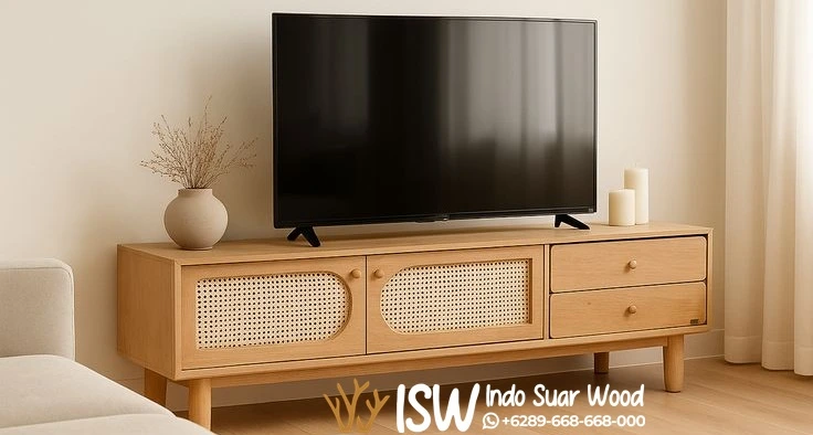 Terbuat dari kayu solid seperti jati atau mahoni dengan permukaan halus yang menonjolkan serat alami kayu. Dilengkapi dengan 2 pintu geser atau bukaan yang terbuat dari anyaman rotan asli. Tekstur rotan membantu sirkulasi udara bagi perangkat elektronik di dalamnya serta menambah kesan organik.
