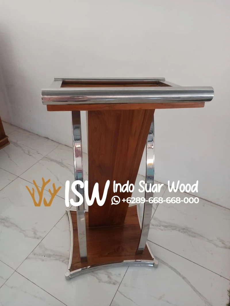 Butuh mimbar yang fungsional tanpa harus ribet? Mimbar minimalis kami adalah solusi yang tepat. Dibuat dari bahan kayu solid berkualitas. Kami Jual Mimbar Kayu Jati di Kota Tuban, mimbar ini menawarkan kekuatan dan kestabilan tanpa bobot yang berlebihan. Kami menghadirkan mimbar kayu dengan variasi stainless yang menggabungkan keindahan alami kayu jati dengan sentuhan modern dari stainless steel berkualitas tinggi. Desainnya yang simpel dan bersih membuatnya cocok untuk berbagai konteks, mulai dari ruang kelas, aula pertemuan, hingga acara keagamaan.