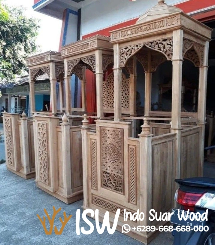 Mimbar masjid ini kami buat dari kayu jati, karena daya tahan dan keindahan alaminya. Kayu jati tua dikenal tahan terhadap rayap, lembab, dan mampu bertahan puluhan tahun. Seratnya yang indah pun semakin memperkaya estetika ukiran. kayu jati terkenal dengan ketahanannya terhadap cuaca dan kerusakan, menjamin mimbar ini dapat bertahan lama dan tetap indah meskipun digunakan dalam waktu yang panjang