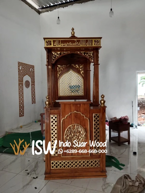 Mimbar ini dibuat dari kayu jati pilihan berkualitas tinggi yang berasal dari hutan jati TPK Perhutani, terkenal akan kekuatan, keawetan, dan serat kayunya yang indah. Finishing natural glossy memberikan tampilan elegan yang menonjolkan warna dan tekstur alami kayu, menjadikannya tampak mewah sekaligus tetap bernuansa islami.Bagian ukirannya dikerjakan secara teliti oleh pengrajin tradisional Demak dan Jepara yang menguasai seni ukir islami.