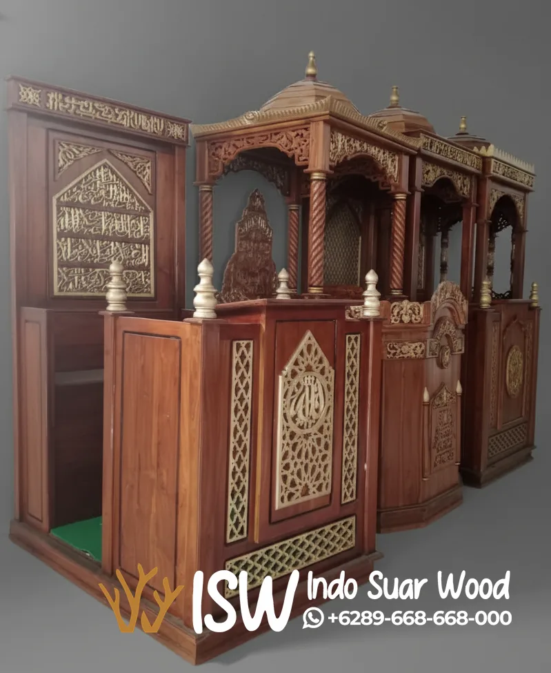 Mimbar Masjid Labuhan Batu dibuat Dengan keahlian tinggi pengrajin profesional yang telah terkenal di dunia, setiap detail mimbar ini mengusung kesempurnaan dalam ukiran tradisional yang elegan. Membawa nuansa kemegahan dan kedamaian dalam setiap ruang ibadah, mimbar ini tidak hanya berfungsi sebagai tempat untuk berdakwah, tetapi juga sebagai karya seni yang memancarkan keindahan dan spiritualitas. Mimbar ini terbuat dari bahan kayu jati yang sudah terjamin ketahanannya hingga puluhan tahun. Proses pengerjaannya menggunakan teknologi terbaru dan diawasi secara teliti, mulai dari pemilihan kayu, proses pemahatan ukiran, sampai proses pengecetan