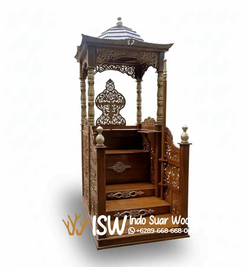 Kami menggunakan bahan-bahan terbaik, seperti kayu jati berkualitas tinggi dan bahan premium lainnya yang tahan lama, indah, dan kokoh. Kayu jati terkenal dengan ketahanannya terhadap cuaca dan kerusakan, menjamin mimbar ini dapat bertahan lama dan tetap indah meskipun digunakan dalam waktu yang panjang.