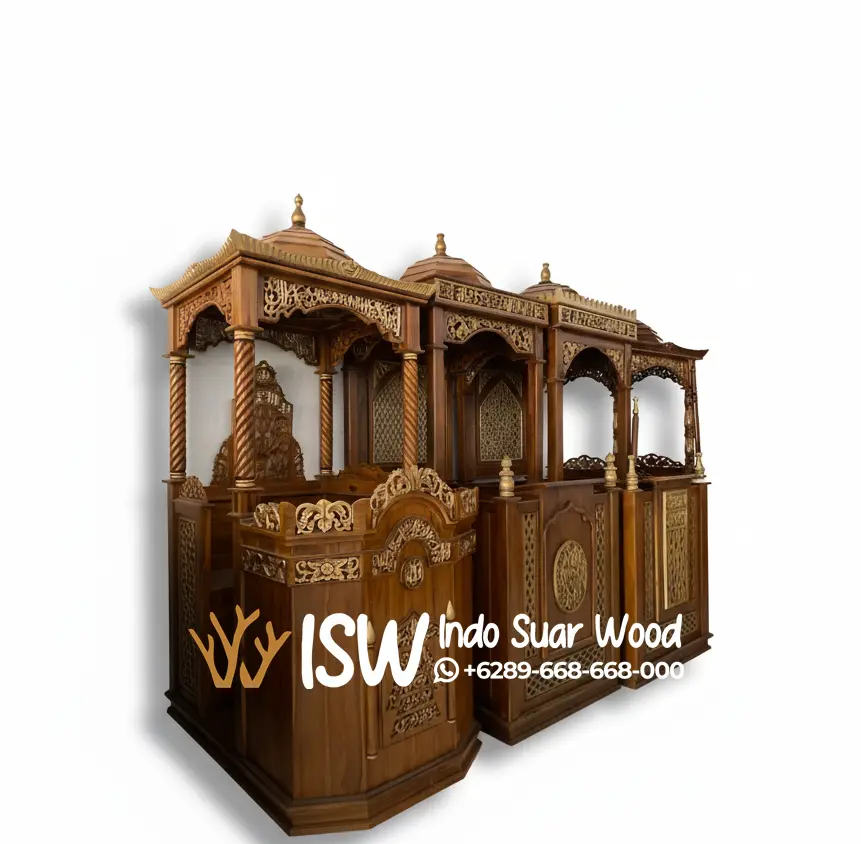 Selain bahan dan pengerjaan yang cukup baik Kami menggunakan finishing halus memberikan tampilan yang bersih dan mudah dirawat yang menjaga keindahan mimbar selama bertahun-tahun. Dirancang dengan sentuhan seni islami yang anggun, mulai dari model atap kubah dan ukiran tangan pada setiap sisi mimbar hingga pola geometris yang menggambarkan keindahan seni Islam.