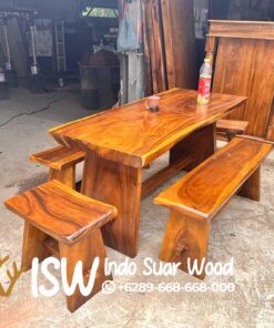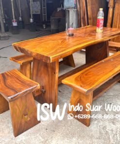 Dalam satu set meja kursi bangku sate ini terdapat 1 meja yang terbuat dari bahan kayu dengan 2 kursi dan 2 bangku panjang. pada proses pembuatan set meja ini dapat menggunakan bahan kayu jenis trembesi atau kayu jati kedua jenis kayu tersebut merupakan kayu terbaik dan sering digunakan sebagai bahan utama dalam pembuatan furniture terutama meja dan kursi utuh tanpa sambungan.